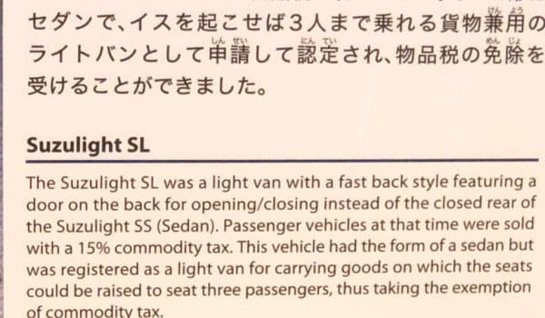 De esta forma nacería el Suzuki Suzulight, un compacto que pesaba menos de 500 kilos y fue diseñado para ser fácil de conducir y mantener, así como accesible económicamente. Bajo el capó equipaba un motor de dos tiempos y dos cilindros con 360cc y ¡solo 16 CV de potencia! además montaba una suspensión independiente de muelles helicoidales y dirección de cremallera, todo un adelanto para la época. Sus dimensiones eran de solo 2.990 mm de largo, 1.295 mm de ancho y 1.400 mm de alto cumpliendo así con la legislación japonesa de “Keijidosha”.