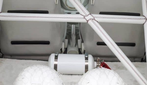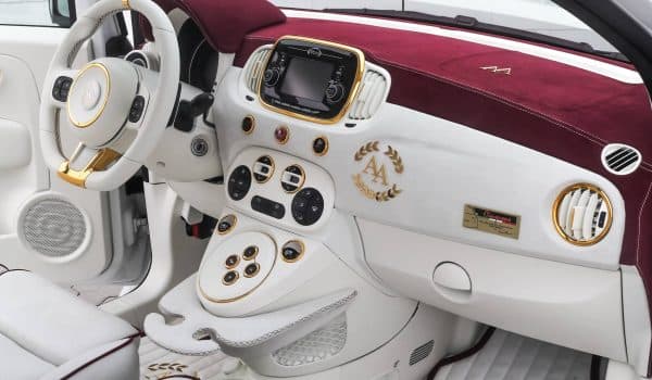 En su interior encontramos un acabado de tres tonos: blanco, dorado y burdeos. La parte superior del salpicadero de cuero está bien unida por medio de una costura color contraste blanco, pero sin duda, lo que más nos llama la atención son los numerosos elementos decorativos dorados y la firma del preparador tanto en las alfombrillas como en el volante o el reposacabezas de los asientos. Algo que tampoco puede pasar desapercibido es que su transmisión automática se maneja por medio de tres botones, como si se tratara de un auténtico superdeportivo.