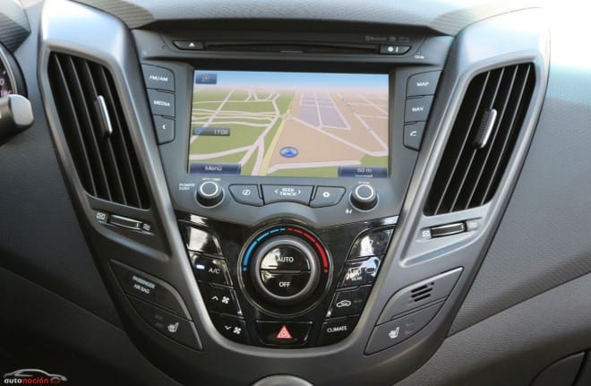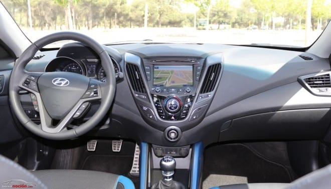 En el cuadro de relojes entraremos un velocímetro analógico y un cuenta revoluciones. Justo en la parte central, bajo la placa “Veloster”, Hyundai ha incorporado el ordenador de abordo con doble display monocromo.