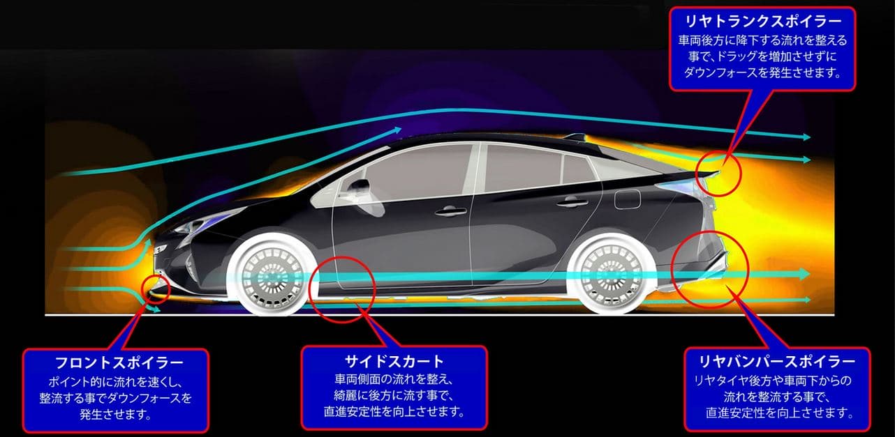 TRD usa las partes y piezas habituales; pero lo que los hace interesantes es que todas sus piezas fueron diseñadas sobre la base de un análisis CFD (Computational Fluid Dynamics) por lo que gracias a este kit de carrocería, el nuevo Prius mejorará la estabilidad en línea recta y aumentar la carga aerodinámica.