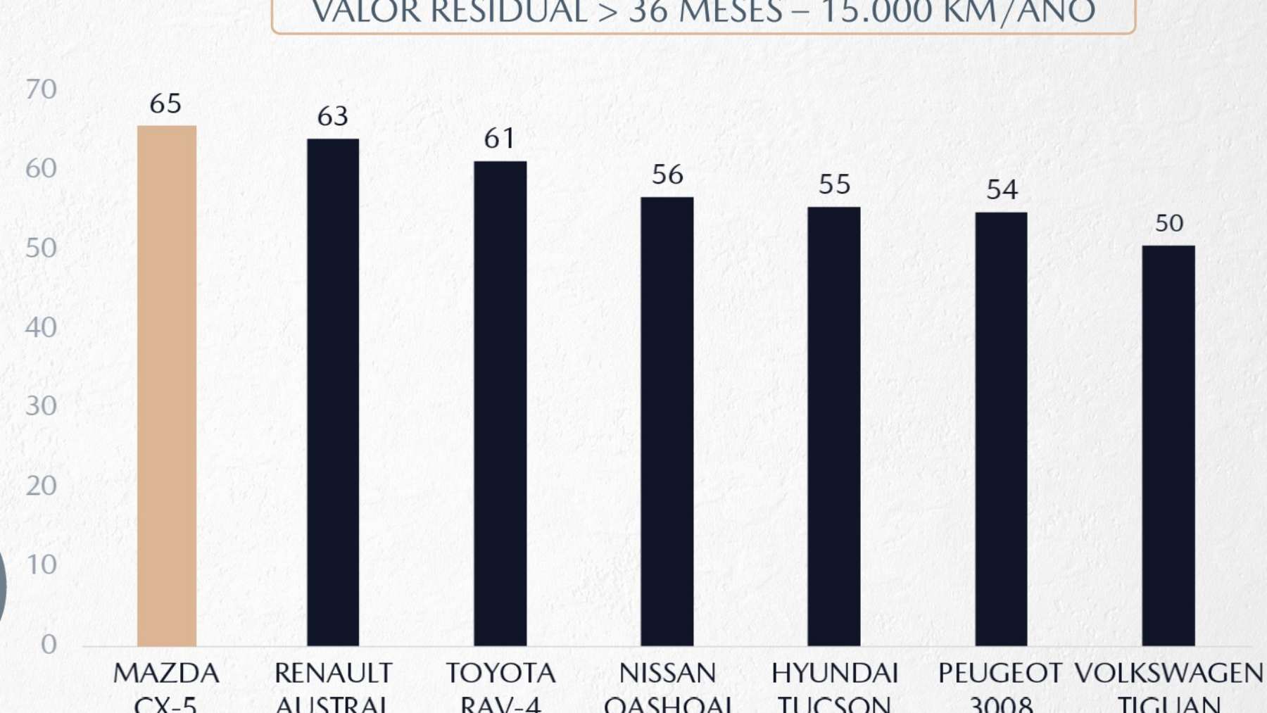 El Mazda CX-5 lidera con un 65% la tabla que te he mostraod. Eso significa que apenas pierde un 35% de su valor en tres años. No está nada mal. En el otro extremo, el Volkswagen Tiguan se queda en un 50%. Es decir, la mitad del coche en dinero se ha evaporado. Si un coche cuesta 30.000 euros, al cabo de sólo tres años podría llegar a costar la mitad.