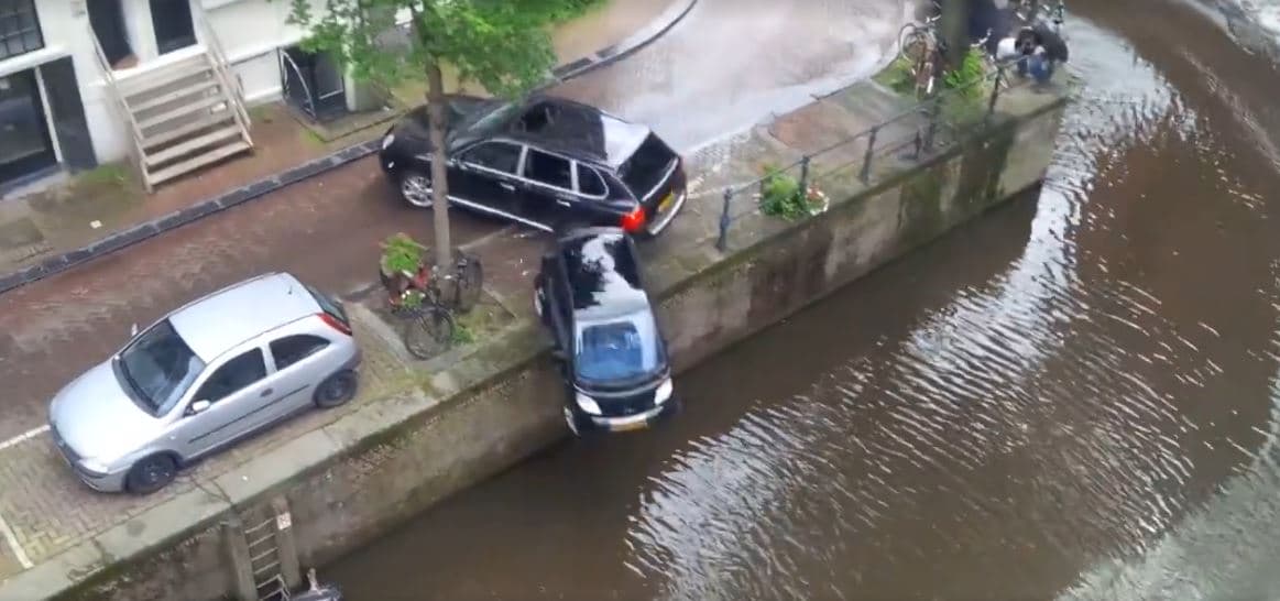 En la escena en cuestión, el Cayenne viene por una estrecha calle y ha de afrontar una curva cerrada, aunque la maña de su conductor no es la suficiente como para evitar el sobreviraje de este gran SUV y la parte trasera del vehículo golpea con fuerza al pequeño smart, el cual cae de lleno en uno de los canales de la ciudad de Amsterdam. Desde luego el vídeo no tiene desperdicio, pero creo que nuestro delincuente no tendría mucho éxito en una persecución real, ya que posteriormente ‘se come’ unas escaleras y necesita dar marcha atrás para continuar con la huida.