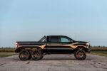 El preparador de Texas ha equipado un motor V8 HPE700 sobrealimentado de 6.2 litros que consigue una potencia total de 705 CV y 915 Nm de par motor, hasta 289 CV y 395 Nm más que la mecánica original. Además de un tercer eje también añade una barra antivuelco, nueva iluminación LED, una cama a medida y una suspensión elevada un total de 20 centímetros.