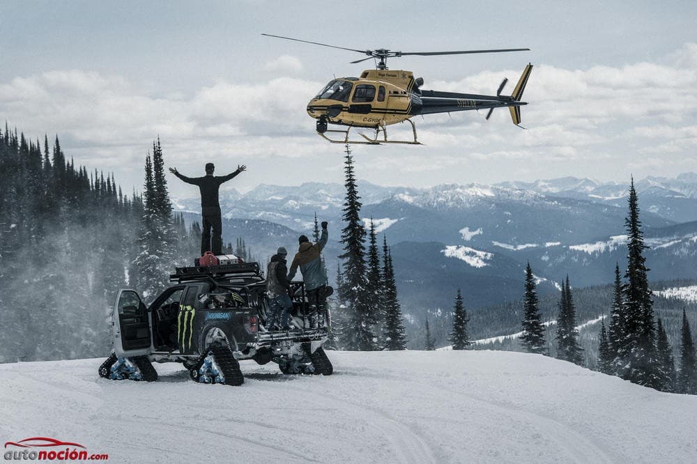 Tras ver su última hazaña en Los Ángeles a bordo del Ford Mustang de 1965, en esta ocasión el elegido es el último juguete de Ken Block, un vehículo de expedición sobre la base del Ford F-150 Raptor al que le han metido mano la división Ford Racing y la marca de bebidas energéticas Monster Energy. Concebido para desplazarse principalmente sobre nieve, el extravagante Ford F-150 RaptorTrax equipa unas orugas Mattracks –similares a las de las motos de nieve- que sustituyen a las ruedas, fijaciones para tablas de snowboard en la parte trasera y un potente motor 6,2 litros V8 sobrealimentado bajo el capó que ronda los 650 CV de potencia.
