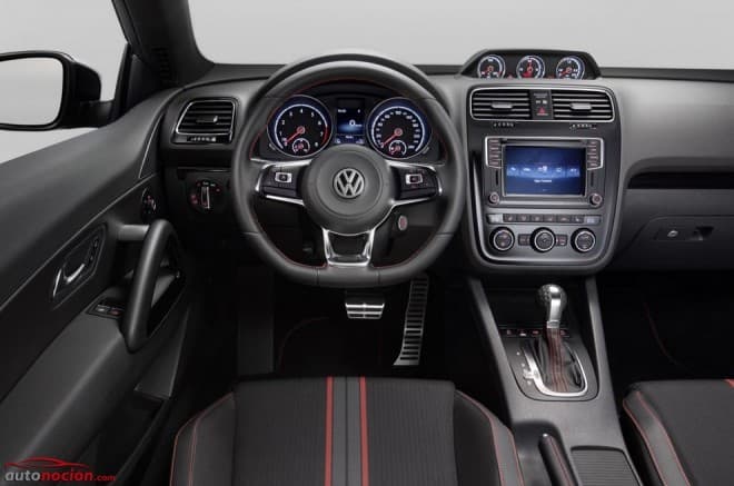 En el interior, el Scirocco GTS mantiene la misma línea deportiva y exclusiva, con el negro y el rojo como colores dominantes. Los acabados decorativos en negro y los detalles lacados en la consola central, los marcos de las tomas de aire y las inserciones en las manetas de las puertas realzan la elegancia del modelo, mientras que las costuras dobles en rojo en los asientos de cuero, el volante o el cambio de marchas, así como otros detalles en este color en las puertas, confieren un toque muy deportivo al interior. Finalmente, el logo GTS tiene también una gran presencia en el interior, ya que aparece en los respaldos de los asientos y las molduras de entrada.