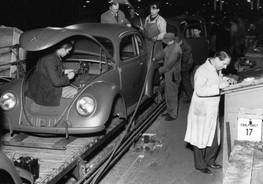 Para el final de la Segunda Guerra Mundial, apenas 630 unidades el “coche del pueblo” se habían construido en la fábrica que posteriormente se convertiría en la actual Wolfsburg y que tenía que ser transformada y adaptada a la fabricación de bienes civiles, tras varios años fabricando bienes principalmente militares.