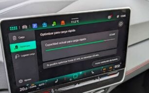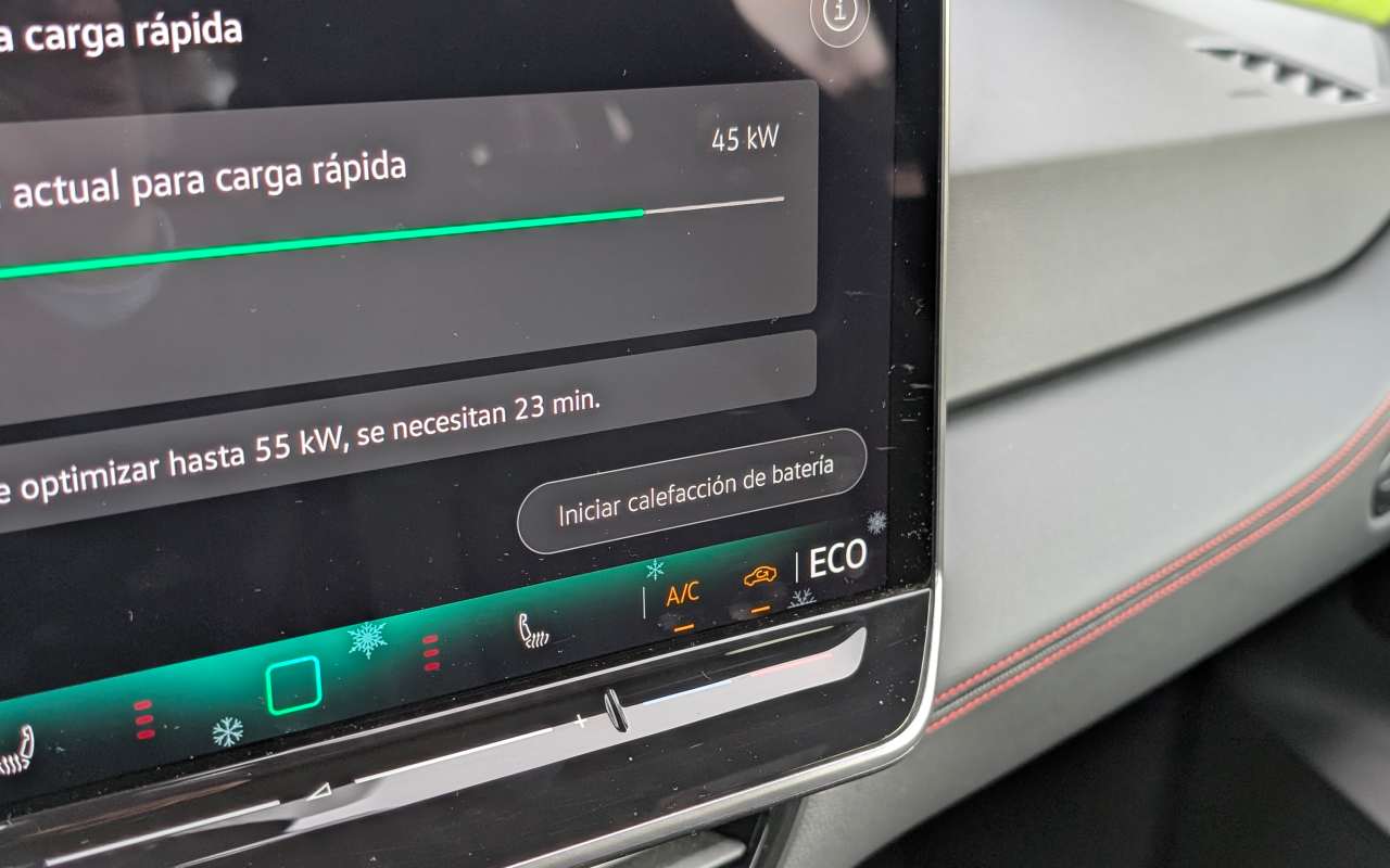 En el apartado de carga rápida, el ID.3 GTX no destaca especialmente frente a algunos de sus rivales más avanzados. Para empezar, el preacondicionamiento de la batería solo es automático si se utiliza la navegación nativa; en caso contrario debe activarse de forma manual y tarda cerca de 30 minutos en llevar la batería a la temperatura óptima para admitir la máxima potencia de carga. En nuestra prueba lo activamos manualmente y, aun así, la potencia sostenida se situó en torno a los 80 kW de media.