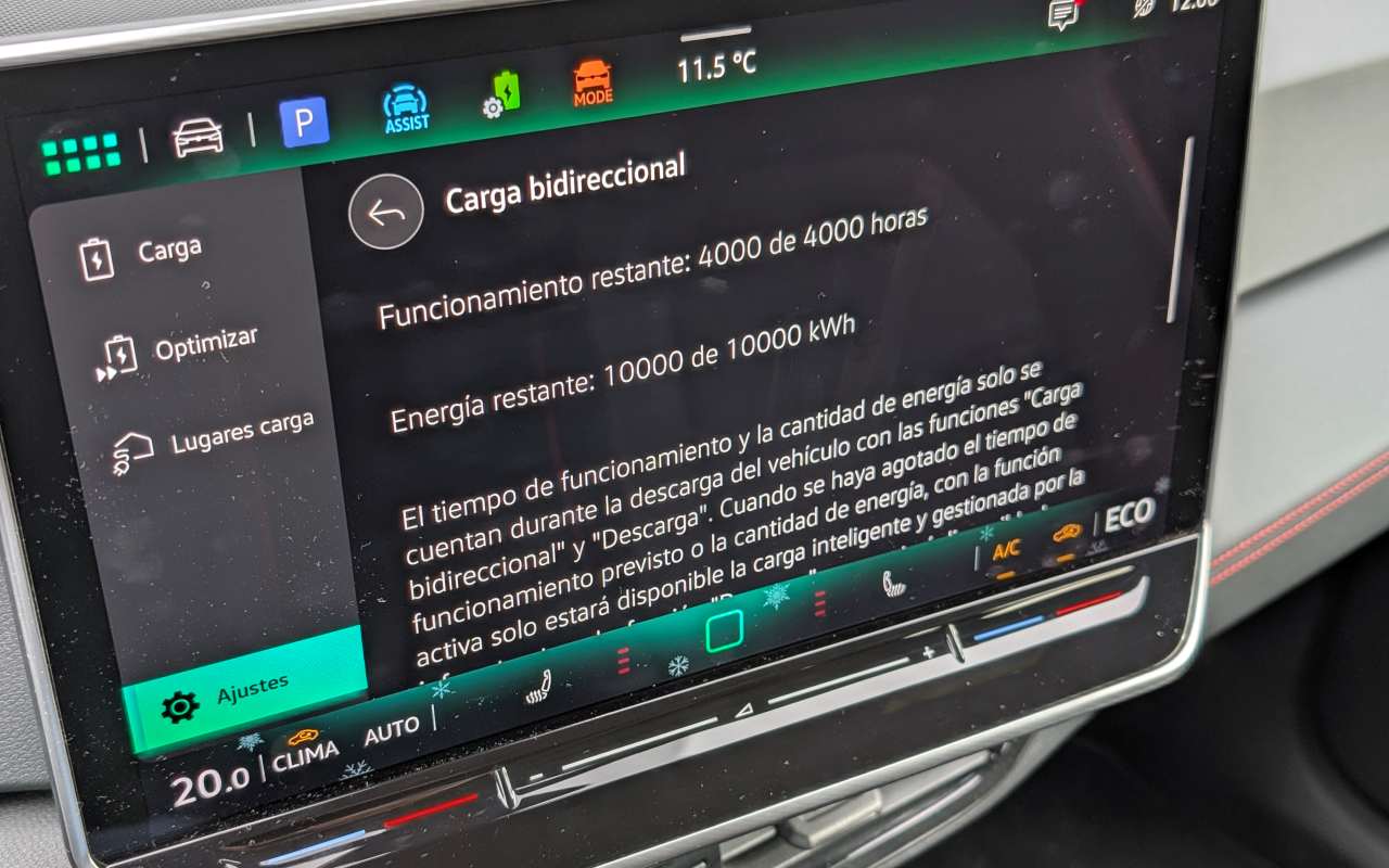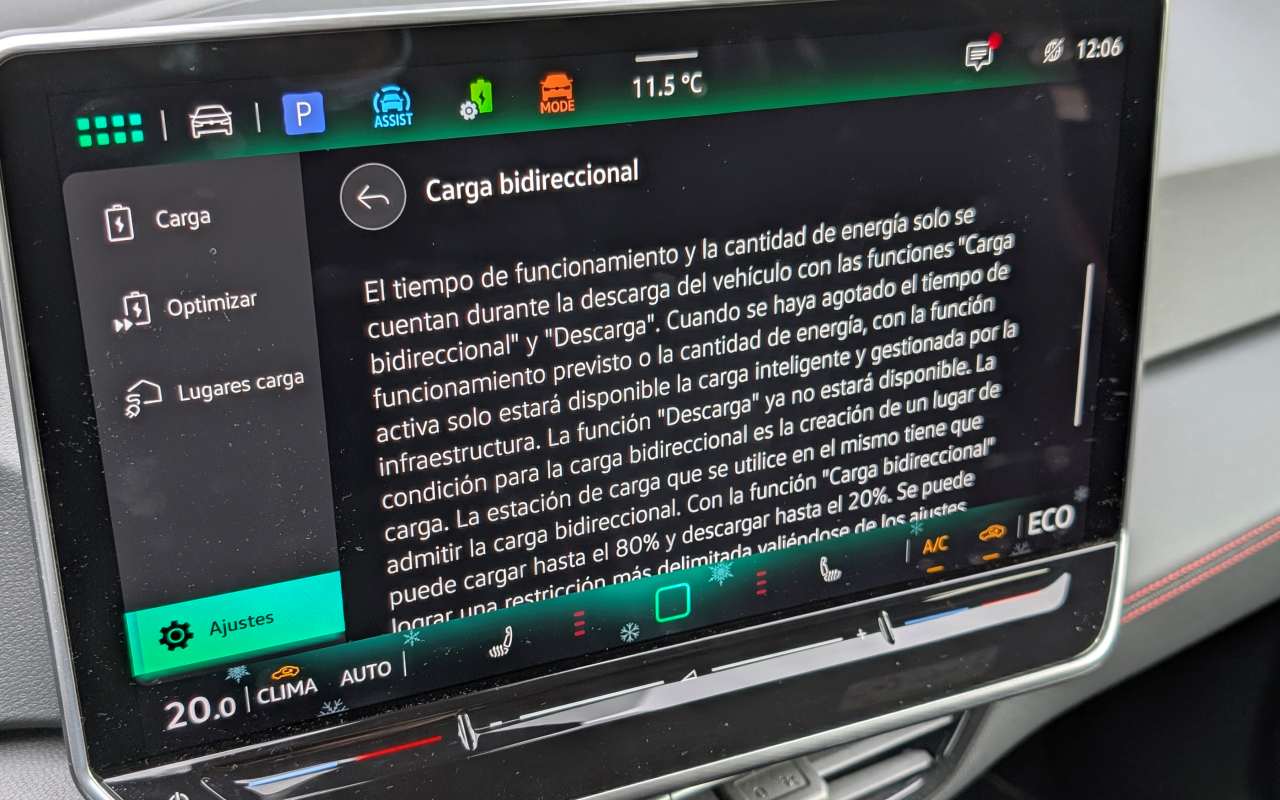 En este apartado de la carga bidireccional, lo que se aprecia en la pantalla del ID.3 GTX refleja bien una tecnología todavía muy verde en su aplicación práctica, al menos tal y como la plantea Volkswagen en este modelo. El sistema muestra claramente límites muy conservadores, tanto en tiempo de funcionamiento (4.000 horas) como en energía total disponible (10.000 kWh), lo que deja claro que la marca prioriza la protección de la batería frente a un uso intensivo real. Además, la función queda muy condicionada a la infraestructura compatible, algo que hoy por hoy es escasa, y a una gestión poco flexible desde el propio vehículo. La información es abundante, pero excesivamente explicativa y poco orientada al usuario medio, lo que refuerza la sensación de que se trata más de una función demostrativa o de futuro que de una solución realmente útil en el día a día. En la práctica, la carga bidireccional está ahí, funciona sobre el papel y suma puntos a nivel tecnológico, pero su usabilidad real es limitada y difícilmente marcará la diferencia para la mayoría de compradores del ID.3 GTX a corto plazo.