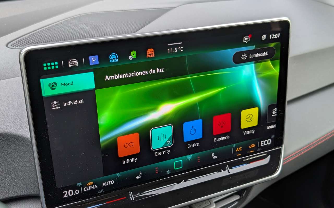 Uno de los aspectos más discutibles es la infrautilización de la barra LED interior (ID. Light) situada bajo el parabrisas. Podría ser un elemento diferencial muy potente, pero en la práctica solo se utiliza para: