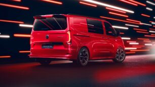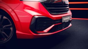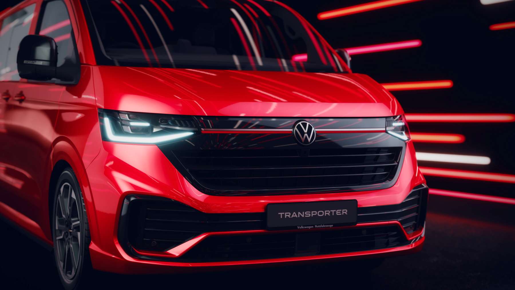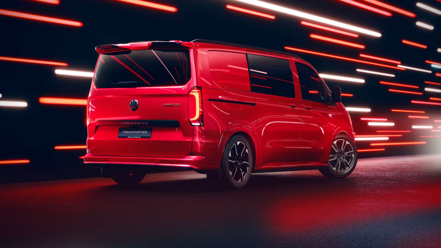 El Transporter Sportline es el tope de gama. Desde fuera impone con una estética afilada y musculosa, una suspensión rebajada 29 mm, paragolpes específicos, taloneras, spoiler trasero y una parrilla en negro brillante atravesada por la clásica línea roja.