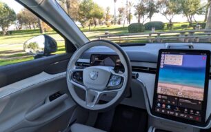 En marcha, el Volvo EX90 sorprende por su capacidad para disimular el tamaño y el peso. La suspensión está claramente orientada al confort y filtra muy bien las irregularidades del asfalto, incluso en firmes deteriorados, manteniendo siempre un elevado nivel de aislamiento. A pesar de sus dimensiones y de unas inercias inevitables, el coche se mueve con una soltura mayor de la esperada, especialmente en vías rápidas y carreteras amplias. El bajo centro de gravedad, consecuencia directa de la batería ubicada en el suelo, se nota de forma clara: el balanceo está bien contenido y la sensación de aplomo es constante, transmitiendo mucha seguridad al conductor incluso a ritmos elevados.