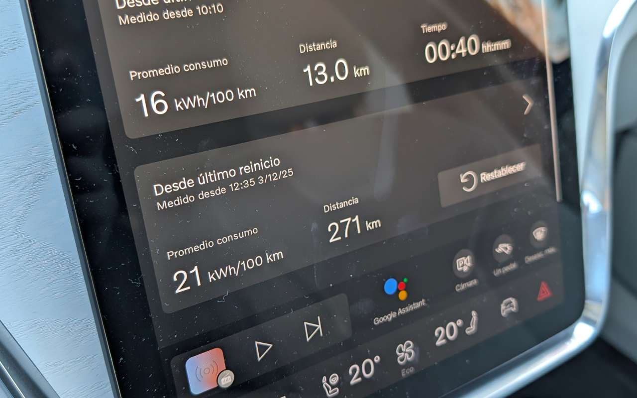 En cuanto al consumo, el EX90 muestra dos caras bastante diferenciadas. En uso urbano, sorprende muy positivamente: hemos registrado cifras cercanas a los 16 kWh/100 km, un dato realmente bajo para un SUV de este tamaño y peso, que demuestra lo bien afinado que está el sistema eléctrico en entornos urbanos. En autopista, sin embargo, la realidad es distinta. A 120 km/h es difícil bajar de los 21 kWh/100 km, y lo más habitual durante la prueba ha sido ver consumos en torno a los 25 kWh/100 km en el ordenador de a bordo, cifras coherentes para la envergadura pero que condicionan la autonomía real.