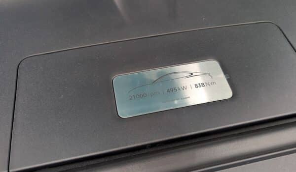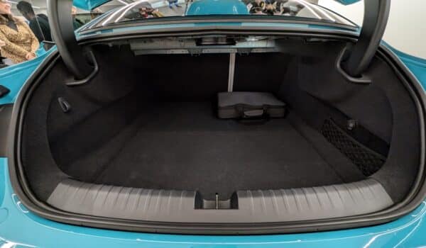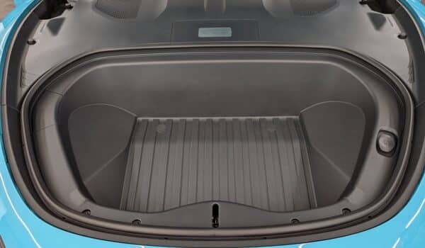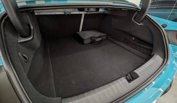 El maletero tiene una capacidad para una maleta grande y tres maletas pequeñas de cabina aproximadamente y cuenta con un pequeño compartimento inferior para guardar cables de carga y herramientas que podamos necesitar para por ejemplo, inflar una rueda. Es totalmente motorizado y cuenta con un espectacular alerón que podemos operar en tiempo real desde la consola central.