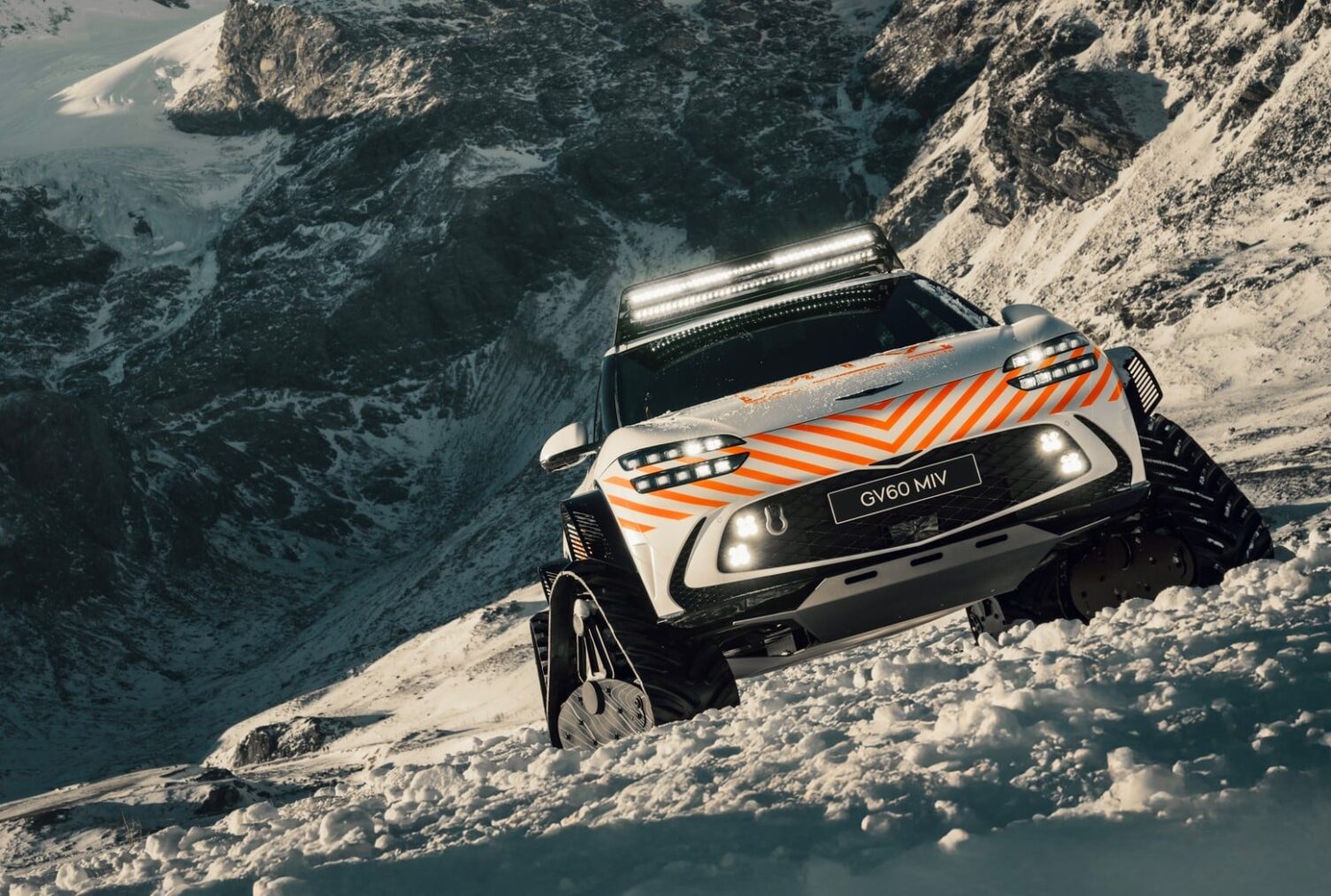 Lo más destacado del GV60 MIV Concept es que equipa unas orugas para nieve y características como asientos deportivos, suministros médicos y sistemas de comunicación y advertencia de emergencia para apoyar las operaciones de rescate en montaña en condiciones extremas.