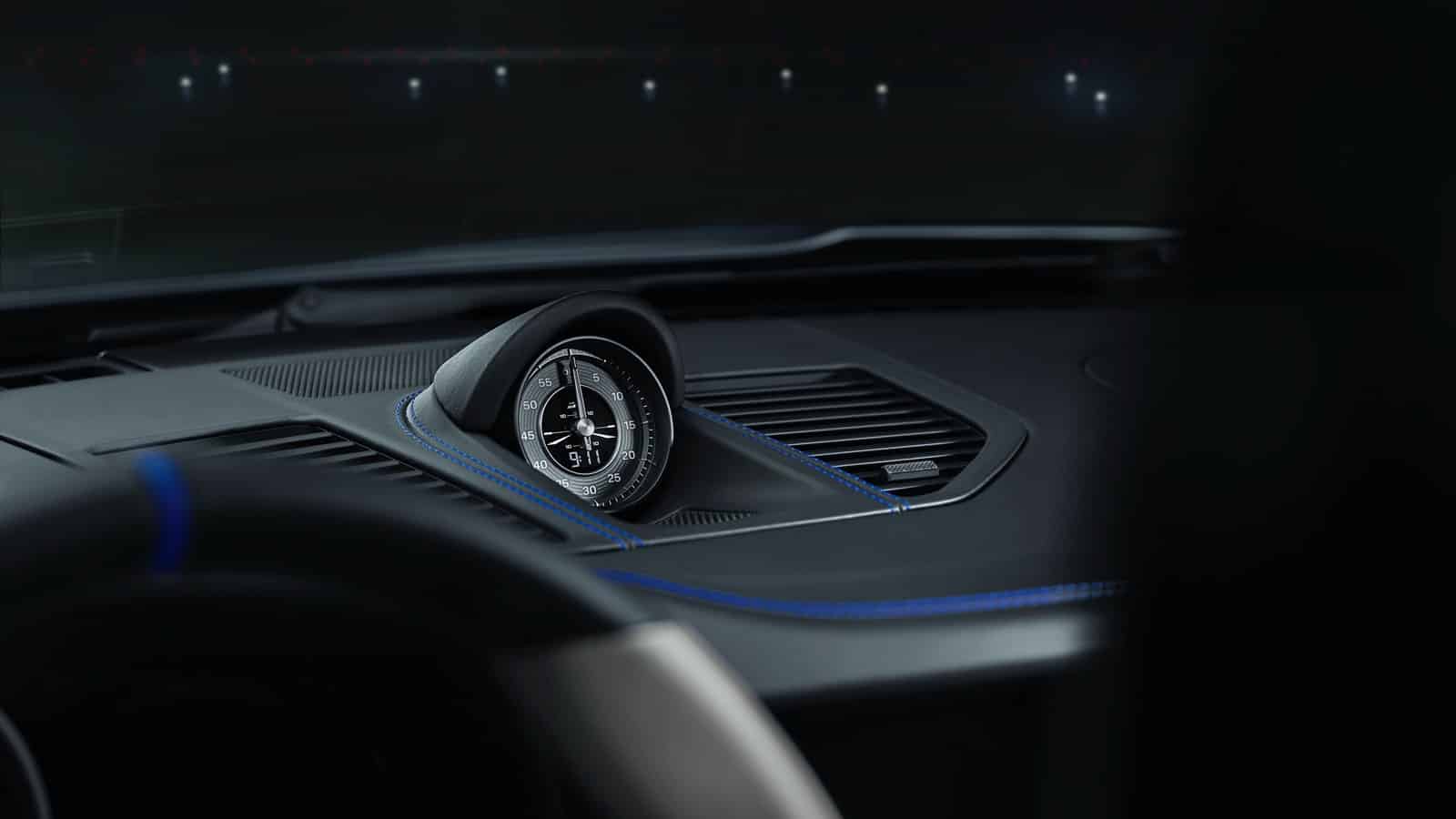 Los asientos delanteros llevan las carcasas posteriores de carbono de alto brillo. El logotipo especial está grabado en los reposacabezas y el tirador de cuero para abatir los respaldos es rojo, como los asientos del avión. Todo el interior está hecho a mano por Porsche Exclusive Manufaktur, y no está disponible para el resto de la gama de producción en serie. Las molduras de los umbrales de puerta llevan la inscripción «No step» iluminada en rojo, un guiño a las señales que se ponen en las alas de los aviones. El cronómetro del pack Sport Chrono también se inspira en la aviación: además del logotipo de esta serie especial, la esfera tiene un horizonte artificial impreso. En la cabina de un avión, un giroscopio como este proporciona información sobre el ángulo de vuelo, es decir, los movimientos sobre los ejes longitudinal y lateral.
