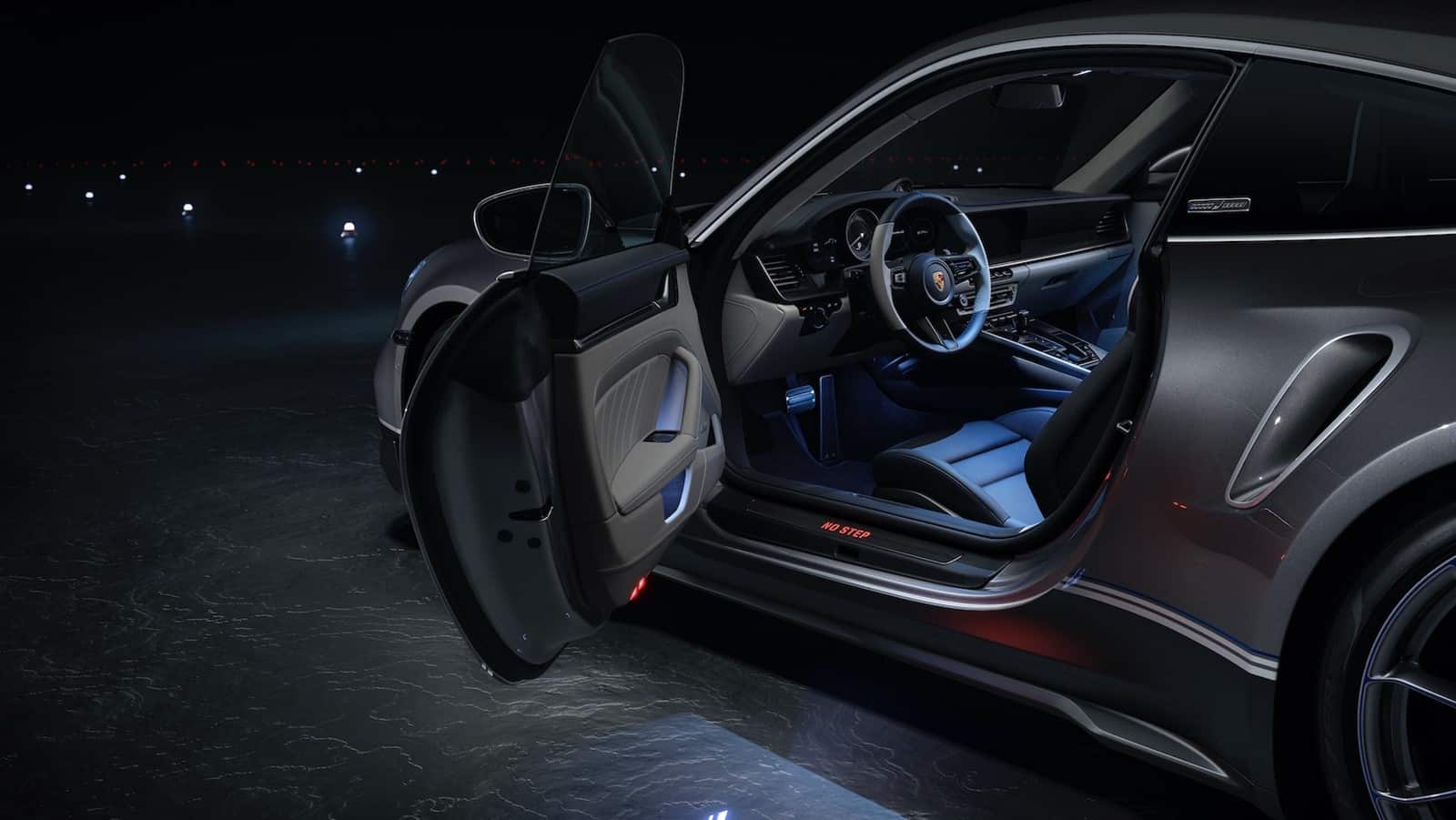 Además, varios detalles de diseño de este 911 Turbo S tan especial tienen un vínculo con la aviación: la matrícula del jet se puede encontrar en la parte inferior del alerón trasero y en los lados de la llave del coche. Las molduras de los umbrales de puerta incorporan la inscripción “No step” (“No pisar”) iluminada en rojo. La esfera del cronógrafo del pack Sport Chrono lleva impreso un horizonte artificial.